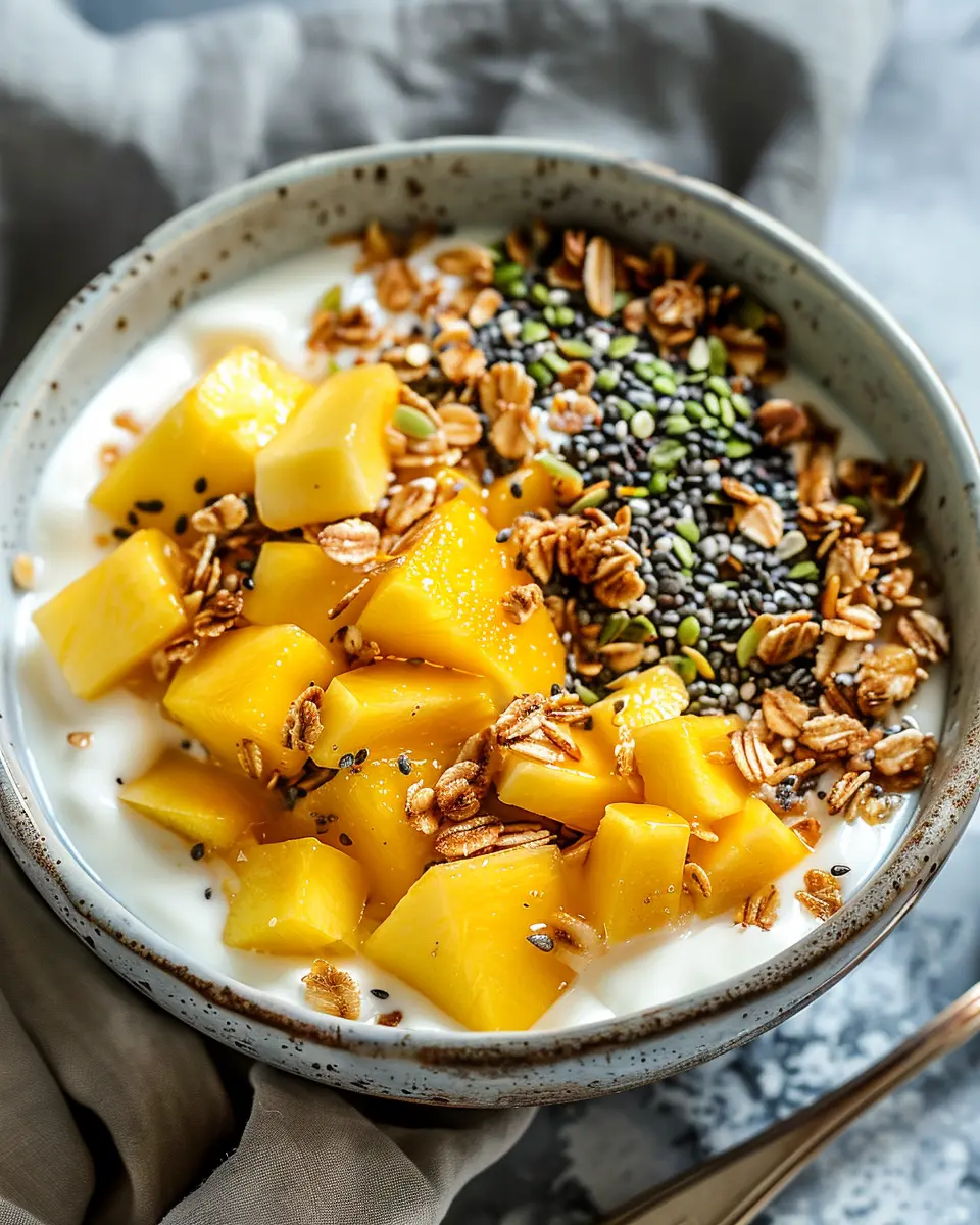 A delicious and nutritious mango yogurt bowl perfect for breakfast.