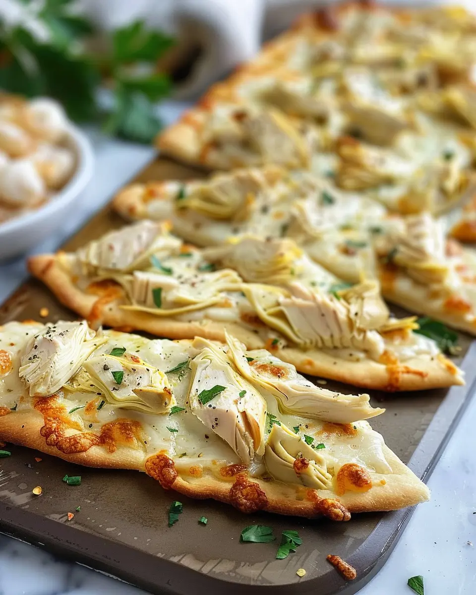 In conclusion, Chicken and Artichoke Flatbread is more than just a meal; it’s a delightful culinary adventure that’s easy to create in your own kitchen. The combination of savory chicken, tender artichokes, and melted cheese offers a balanced flavor profile that impresses every time. Not only is it a crowd-pleaser, but it also provides a great opportunity to get creative with your toppings or crust preferences. Plus, preparing this dish at home means you can cater to your own taste, dietary needs, and fresh ingredients. So why not gather your friends, fire up the oven, and enjoy this delectable flatbread?
