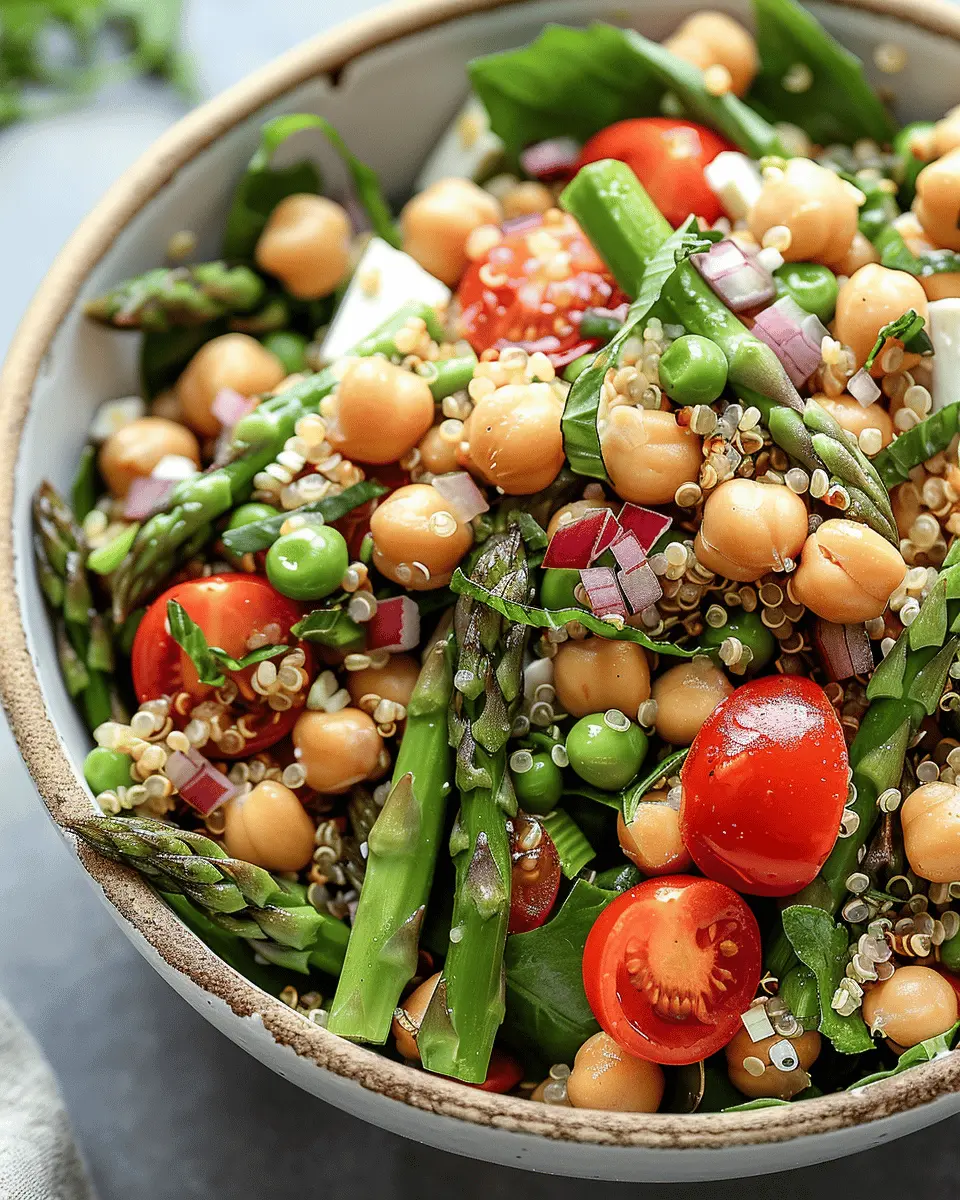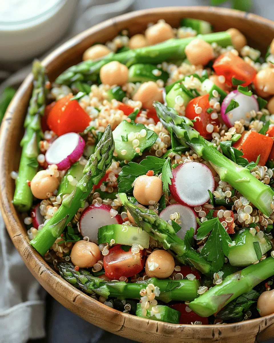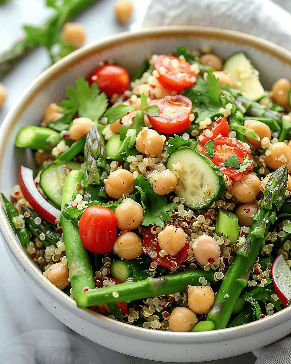 Discover a refreshing and nutritious salad recipe featuring asparagus, chickpeas, and quinoa.