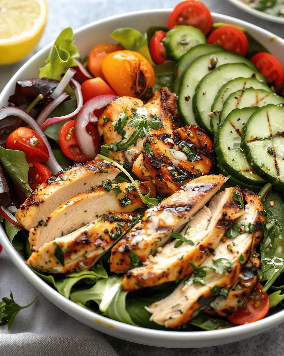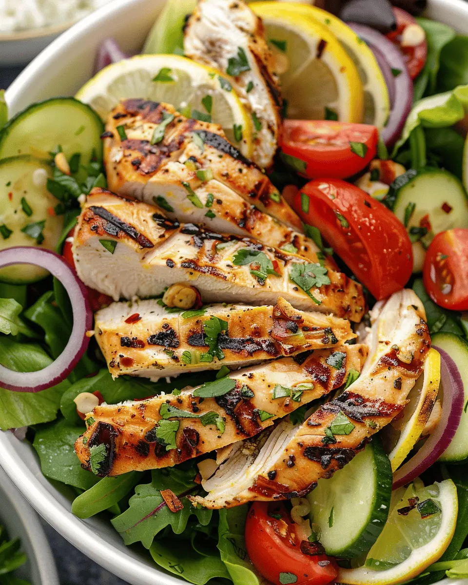 A refreshing and flavorful salad featuring grilled lemon herb chicken, perfect for lunch or dinner.