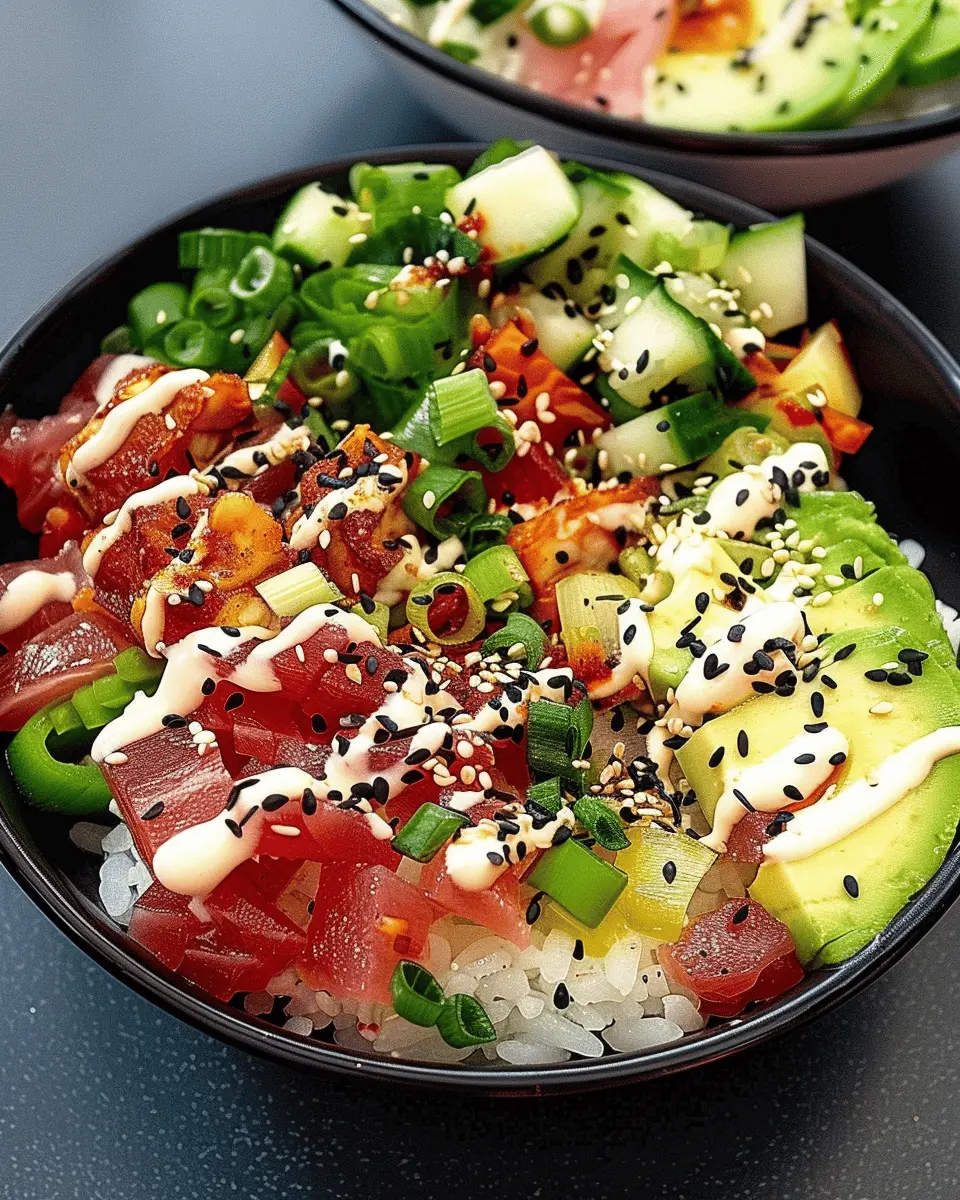 Tuna is an excellent choice for this poke bowl, but you can pump up the protein with alternatives like grilled chicken, turkey bacon, or even chickpeas for a plant-based twist. For added variety, you might explore options like smoked salmon or grilled shrimp as well.