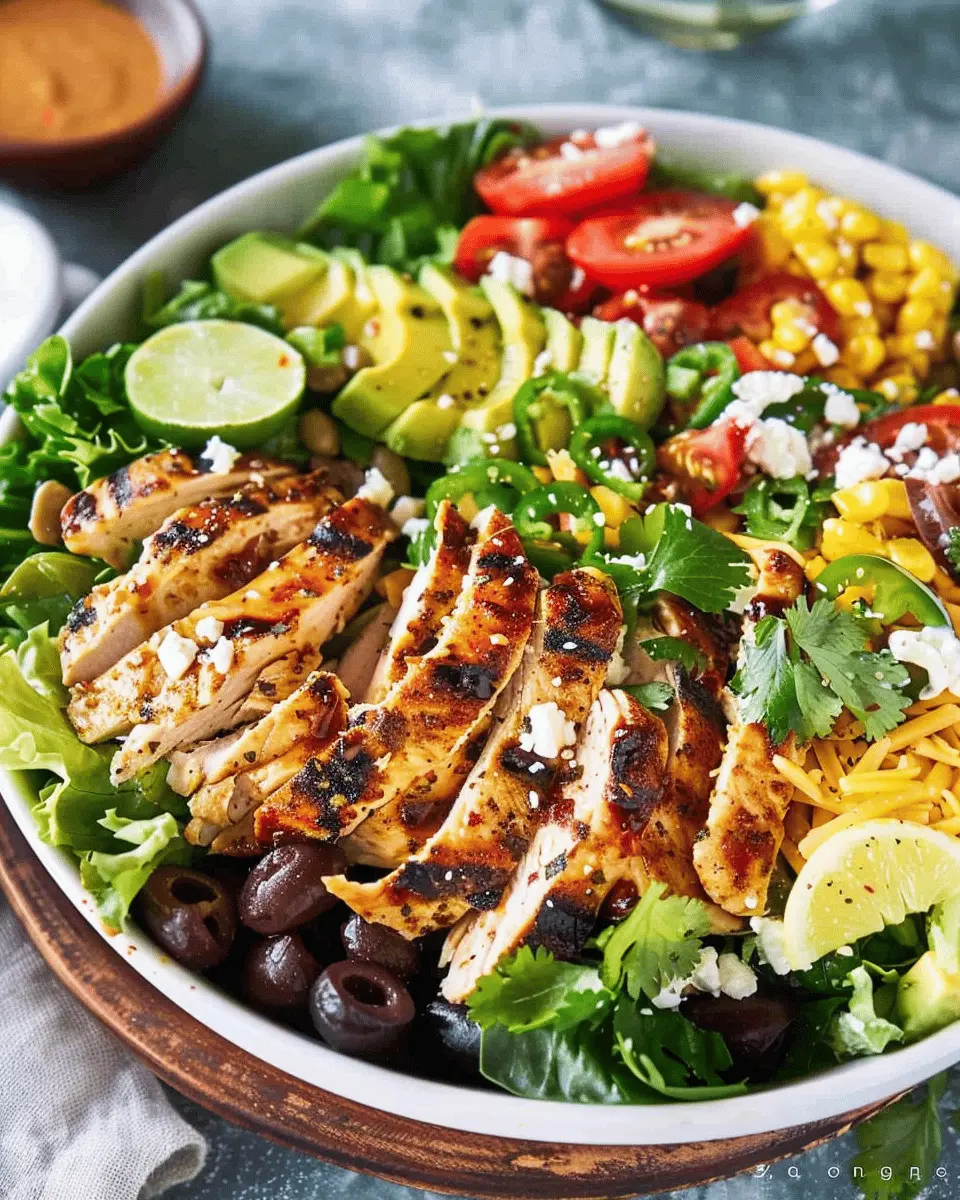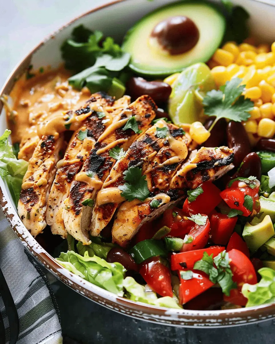 Presentation matters! Use a large, shallow bowl to showcase your colorful ingredients. Layer your salad artfully, perhaps starting with a bed of greens followed by the chicken, then sprinkle toppings like Turkey Bacon or beans. Finish with a drizzle of dressing for a professional touch. For a decorative flair, garnish with fresh cilantro or avocado slices, highlighting the Southwestern theme.