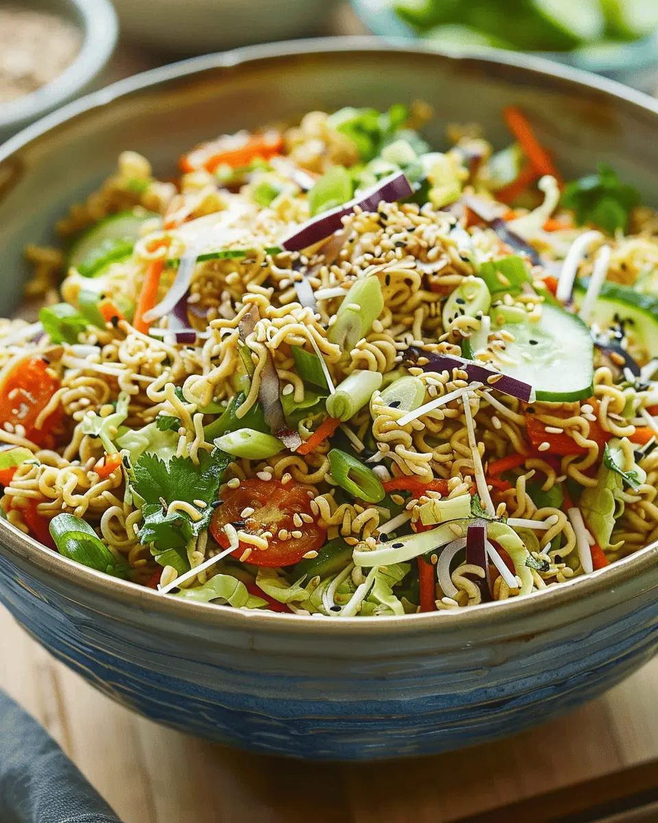 This vibrant salad combines the crunch of fresh veggies with the umami flavor of ramen noodles. Start with a bed of shredded cabbage, add colorful bell peppers, carrots, and scallions.