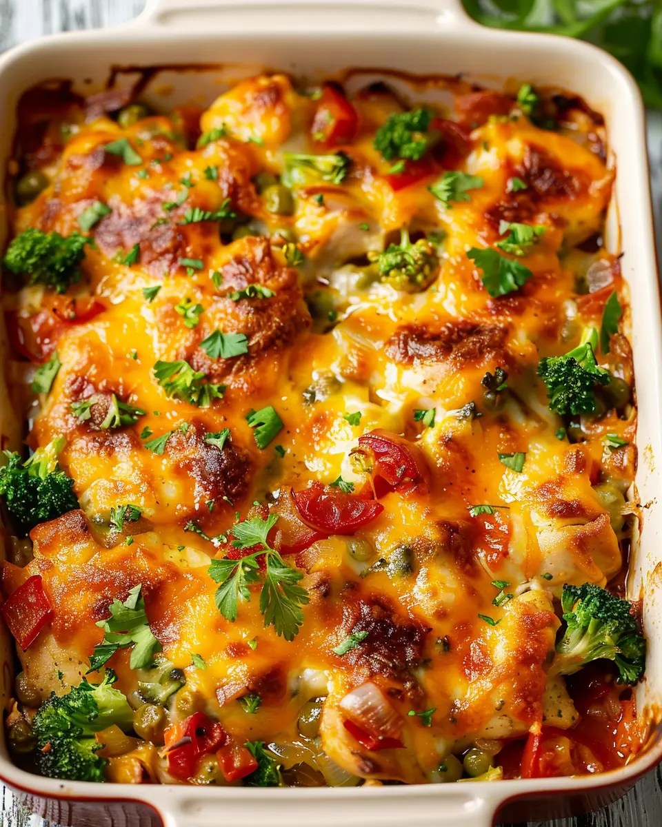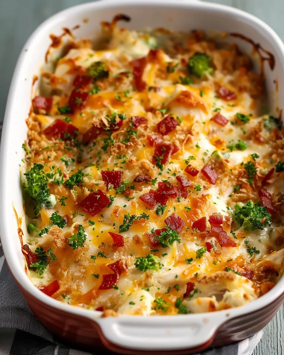A delicious low carb casserole featuring chicken, turkey bacon, and a medley of vegetables.
