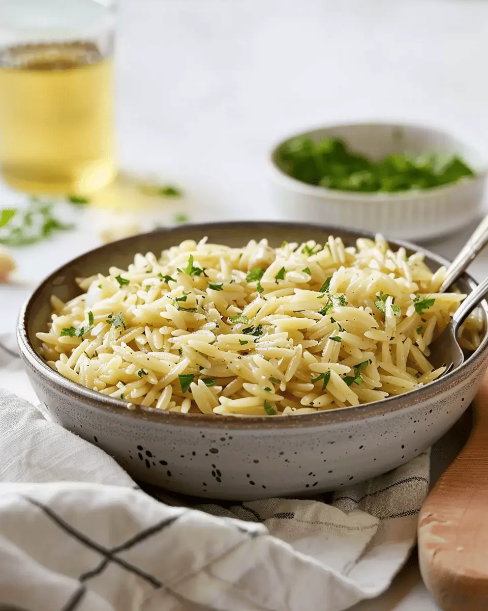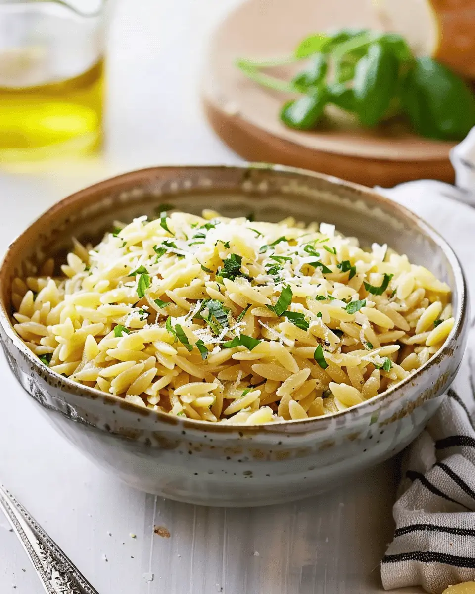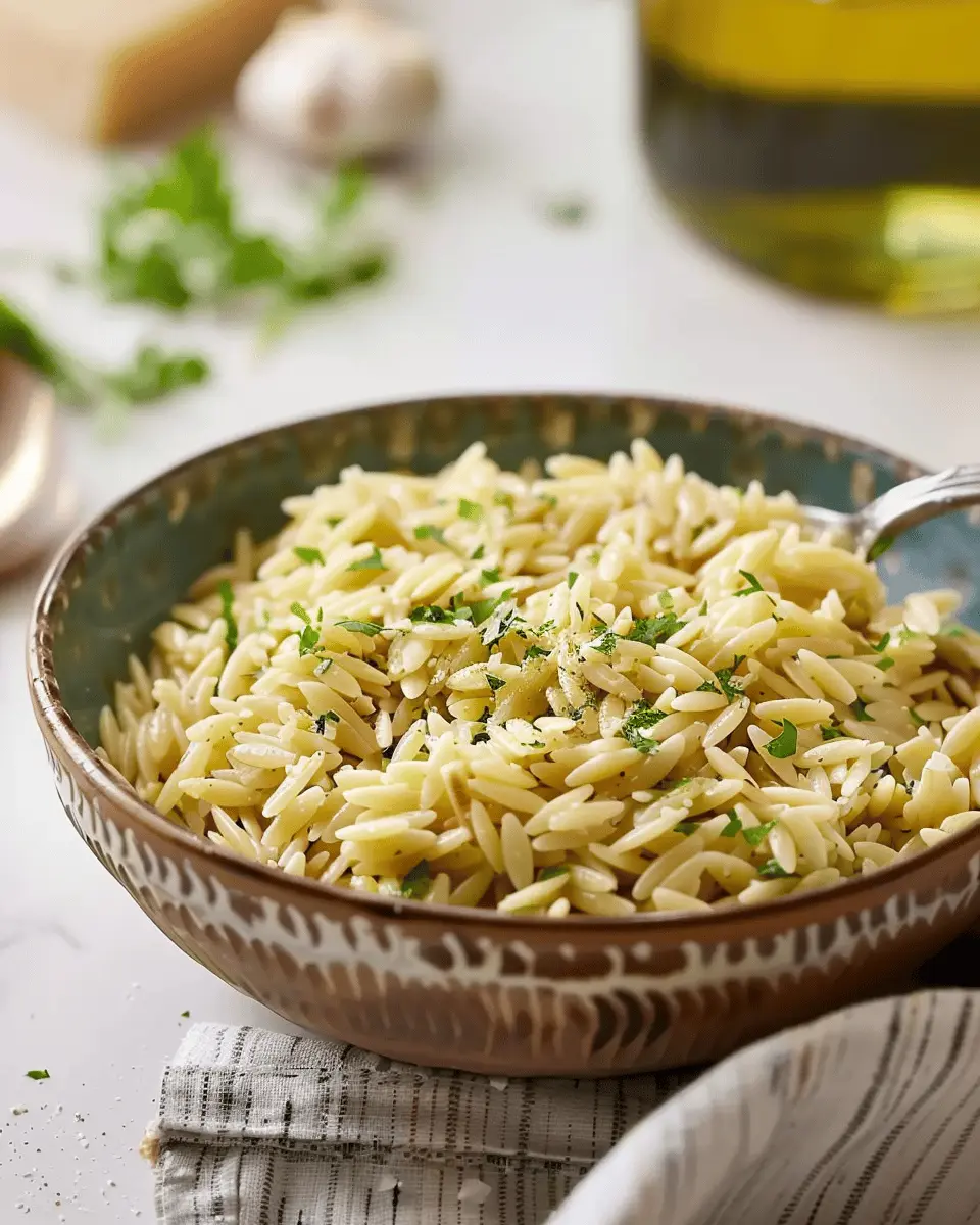 A delicious and easy side dish that complements any meal, featuring orzo pasta with garlic and Parmesan cheese.