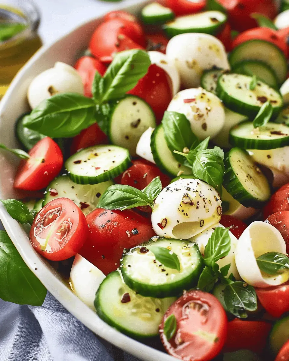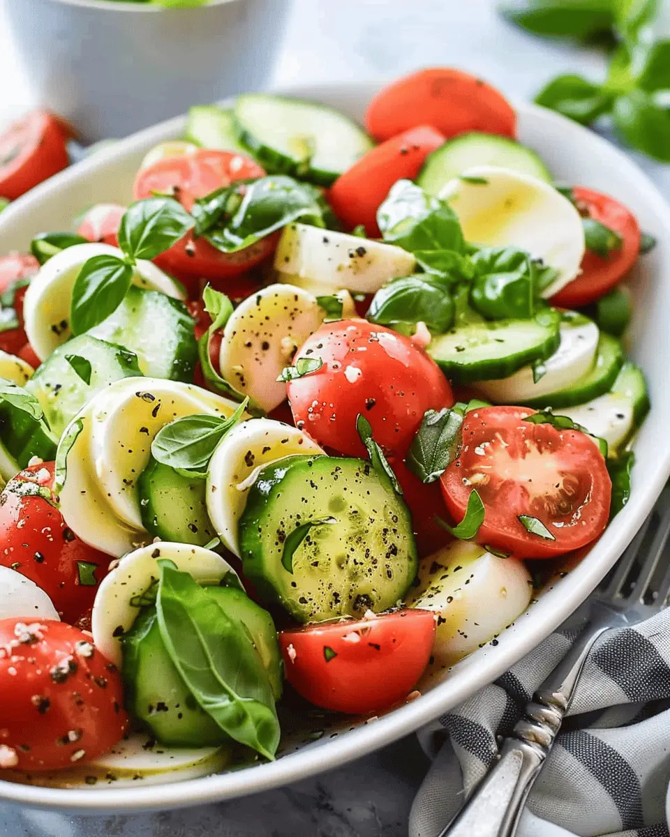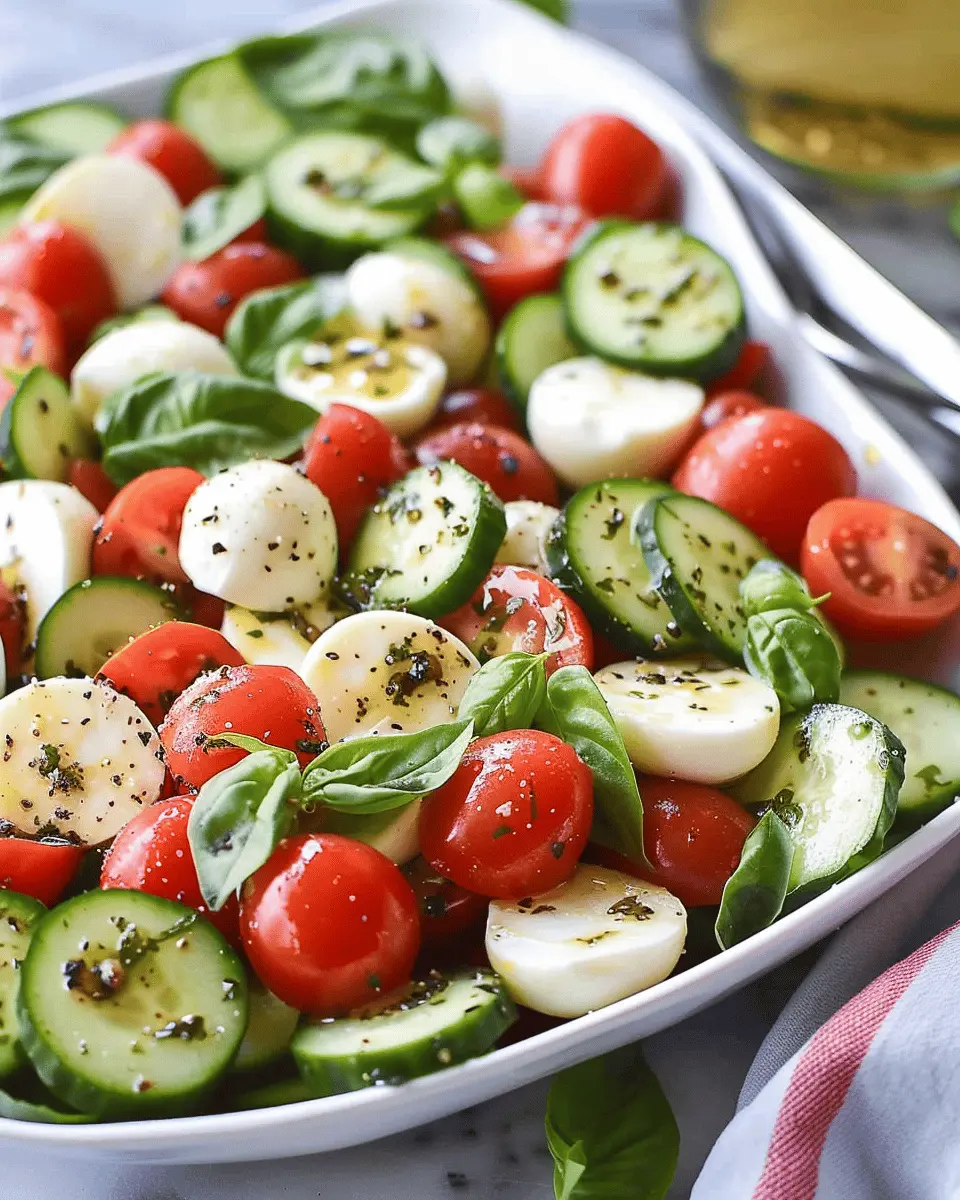 Make your salad the star of the table with simple plating tricks. Use a large, colorful platter to spread out the Cucumber Caprese Salad, allowing its vibrant colors to pop. Layer the cucumbers, basil, and mozzarella in a spiral design, or create a stack for an elegant tower effect. Drizzling a balsamic glaze artfully over the top can add that finishing touch—turning this easy side into a head-turning showstopper.