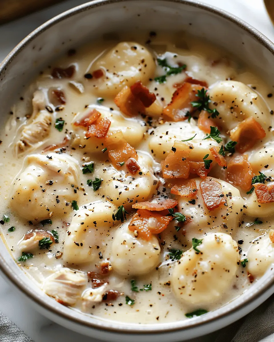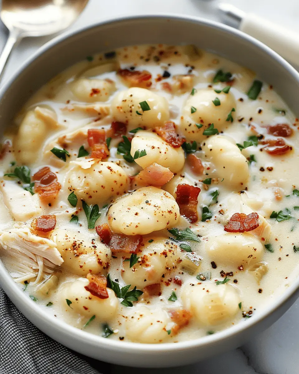 A delicious and creamy soup featuring chicken, turkey bacon, and gnocchi, perfect for a quick meal.