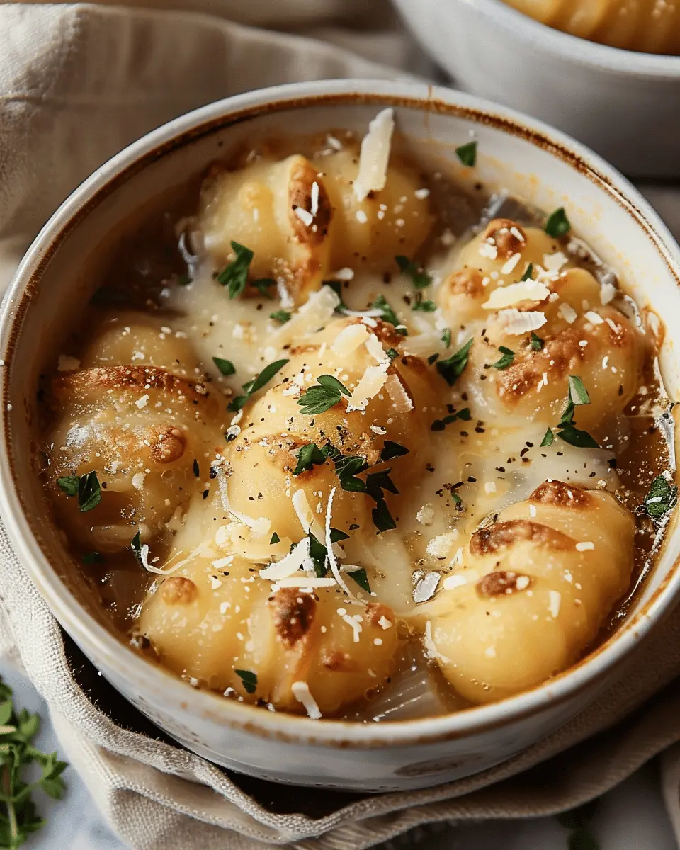 Easy Soup Recipes: Indulgent French Onion Gnocchi Soup with Turkey Bacon