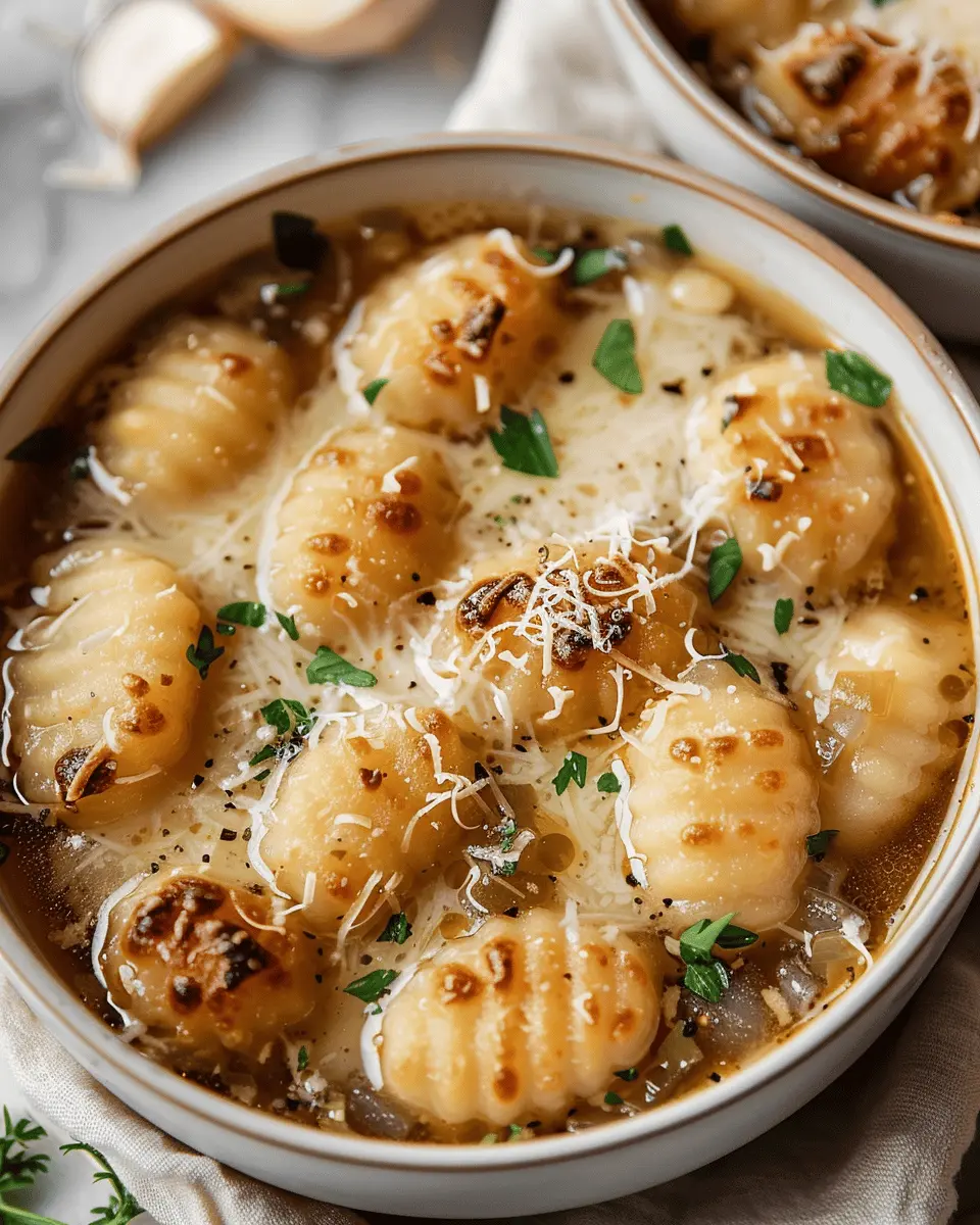 When diving into your delicious French Onion Gnocchi Soup, consider pairing it with a crusty baguette or a soft sourdough roll. The bread not only complements the richness of the soup but also offers a satisfying crunch. If you’re feeling adventurous, sprinkle some shredded Gruyère or Parmesan cheese on top of your soup for an extra layer of flavor. A drizzle of olive oil or a dash of fresh herbs can take your meal to the next level.