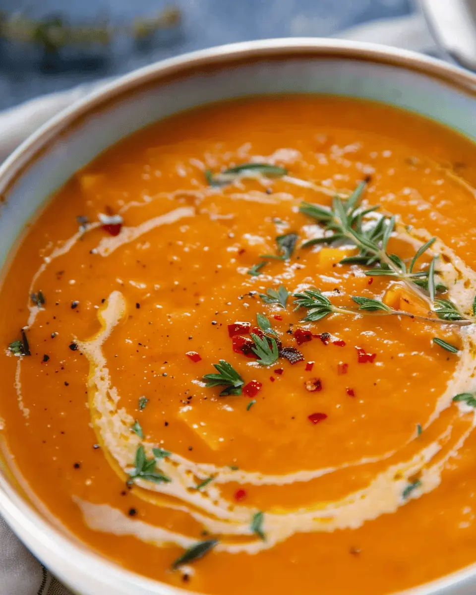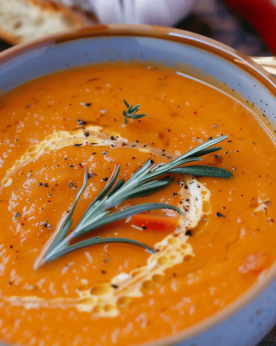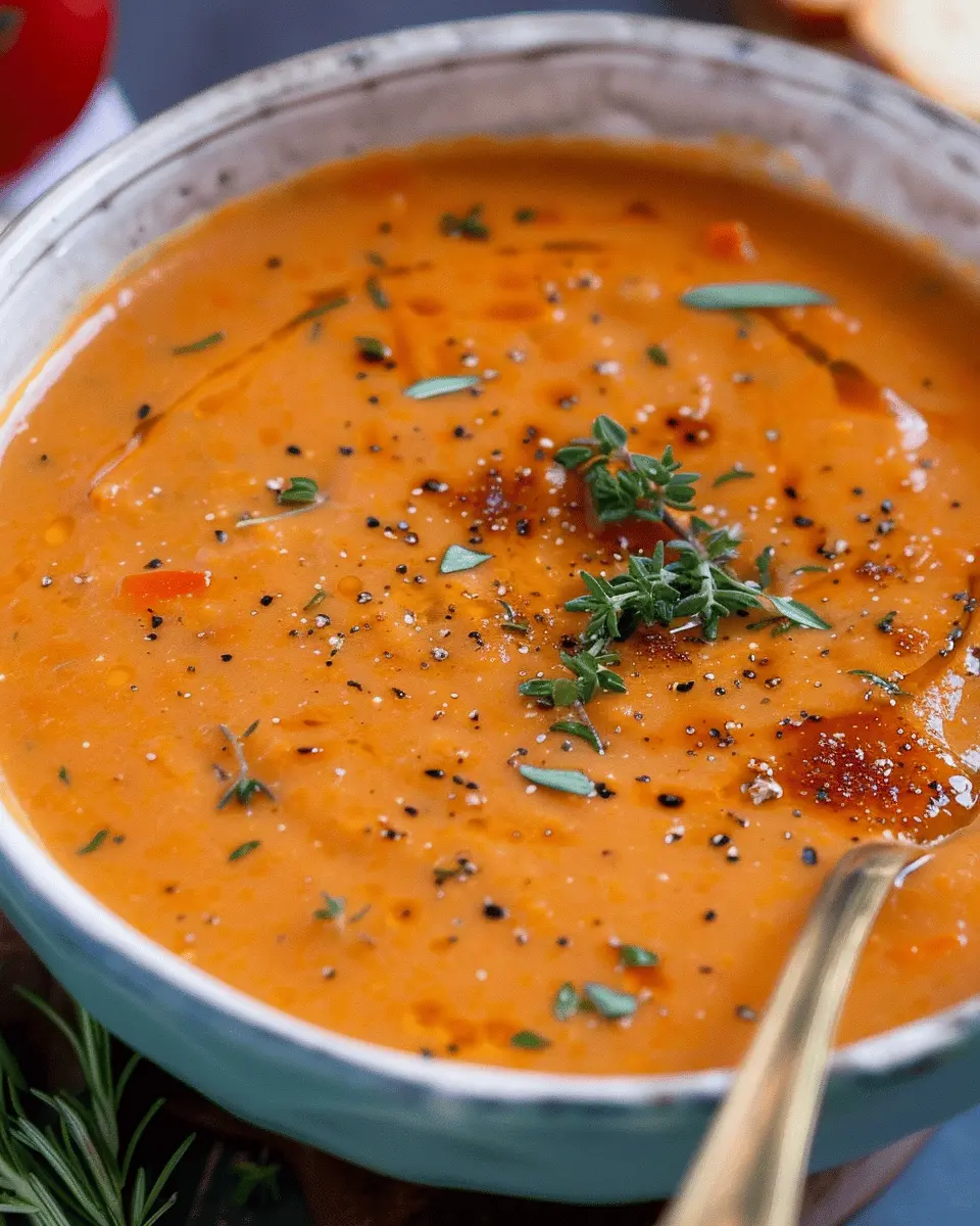 A delicious and healthy roasted vegetable soup that is smooth and creamy, perfect for a wholesome meal.