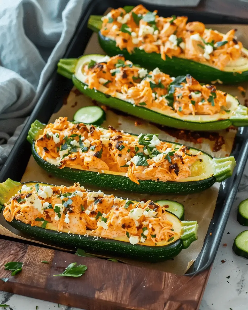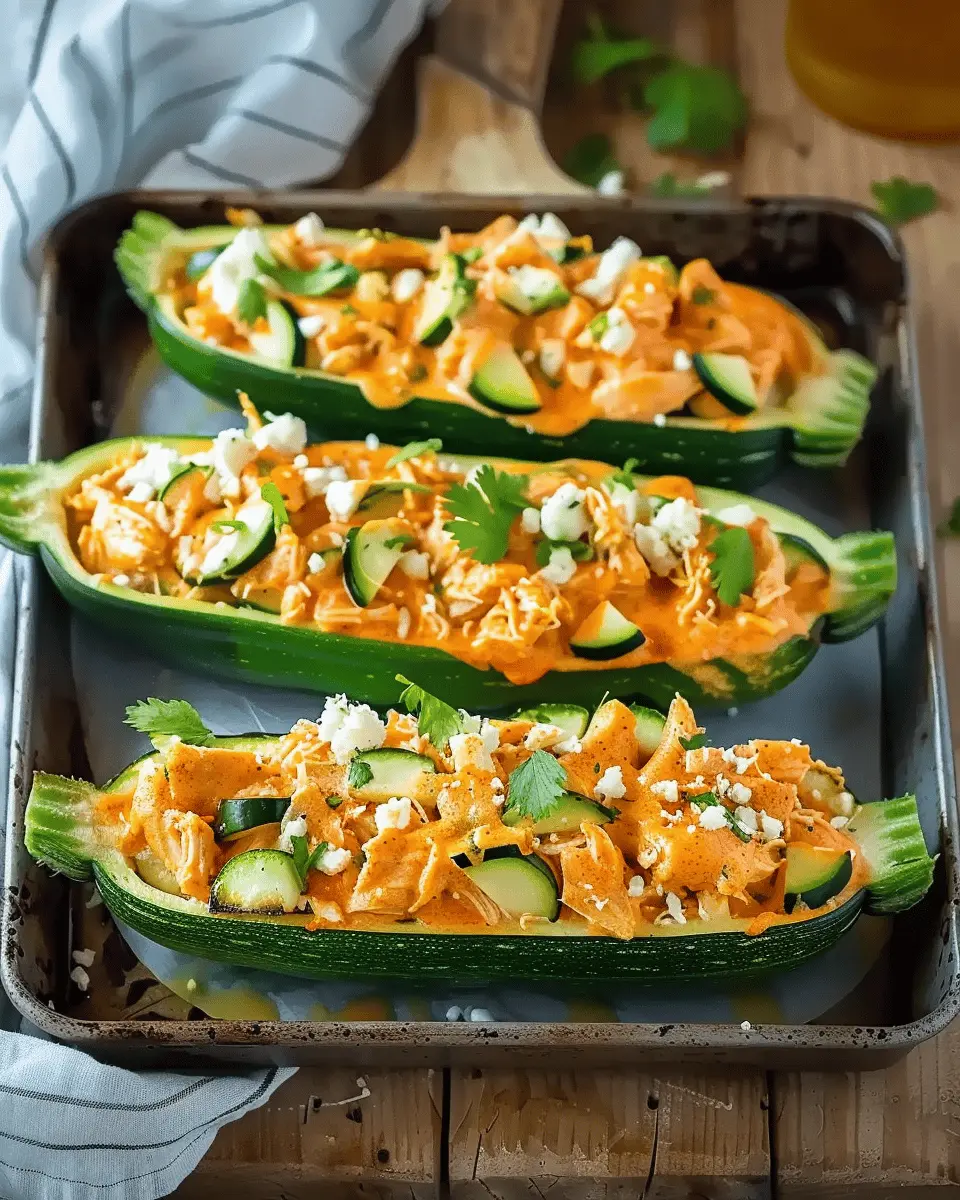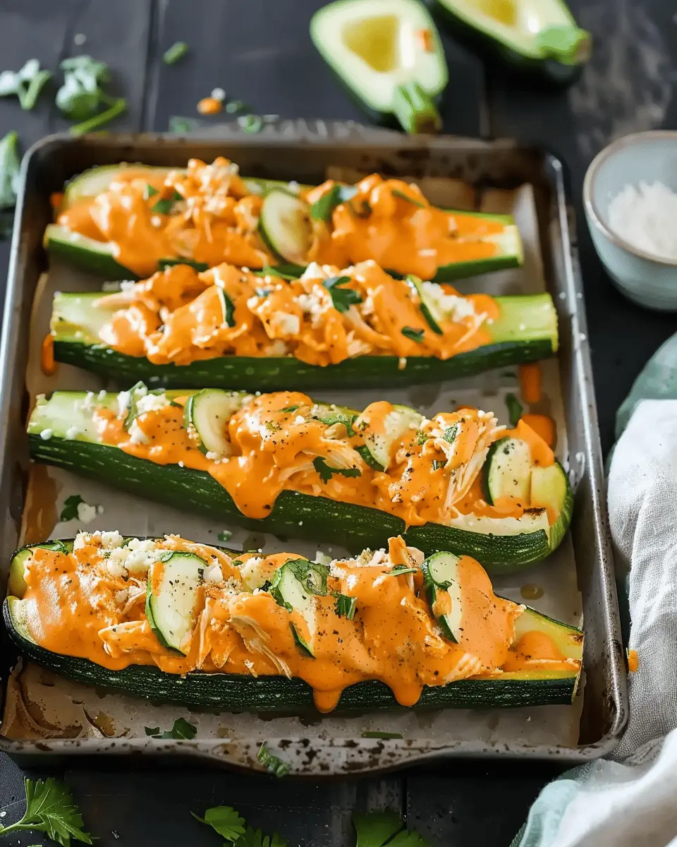 • Buffalo Chicken Stuffed Zucchini Boats: The star of the show! Stuff halved zucchini with spicy shredded chicken for a satisfying meal.