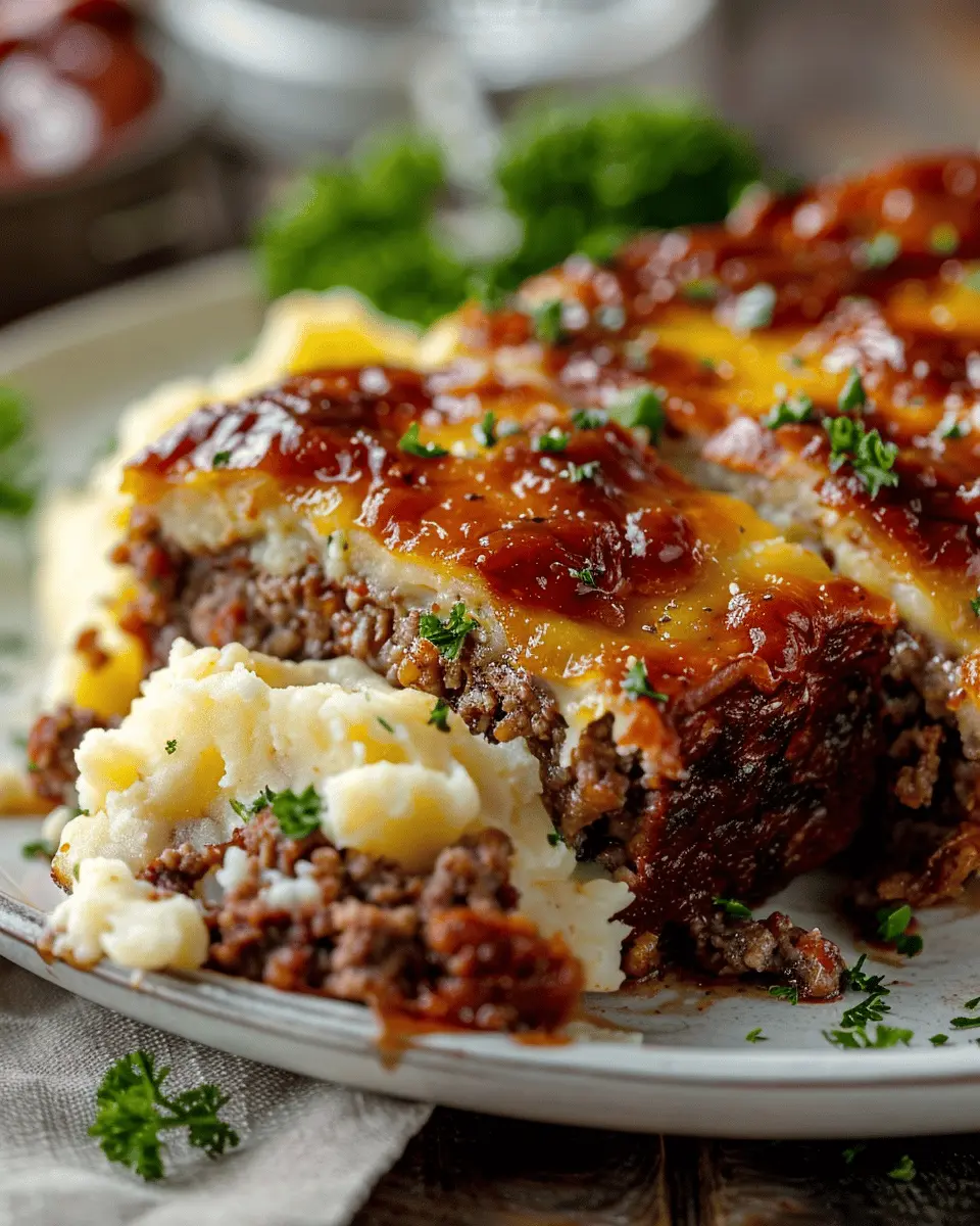 This Meatloaf with Mashed Potatoes and Cheese is a comforting dish that combines savory meatloaf with creamy mashed potatoes and rich cheese.