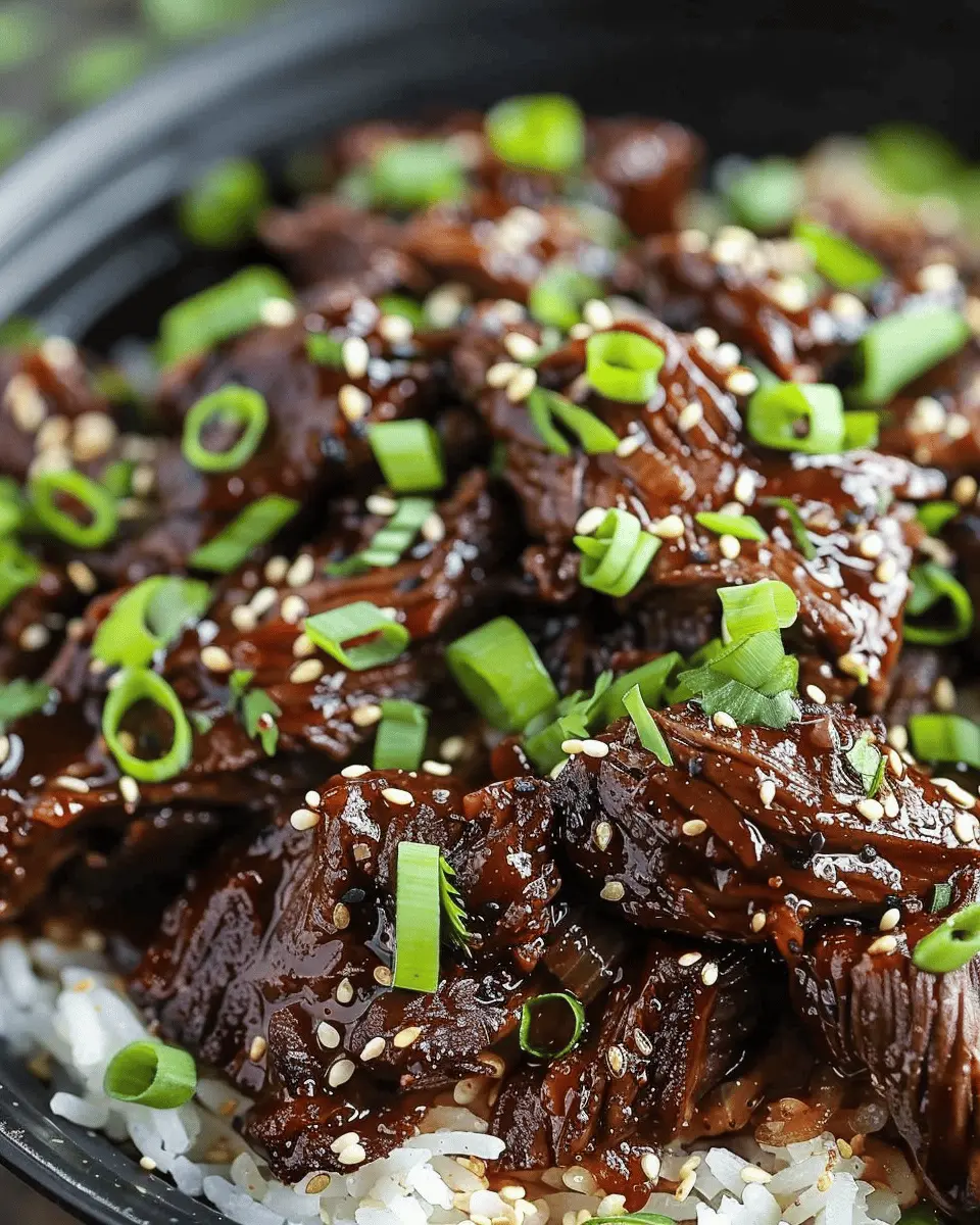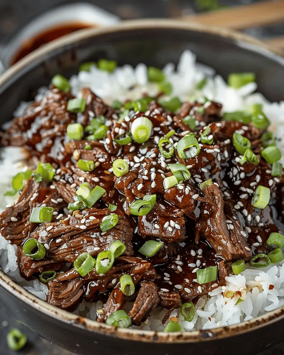 Once cooking is complete, the beef should be tender enough to shred with a fork. Serve it over cooked rice, garnished with sliced green onions and a sprinkle of sesame seeds.