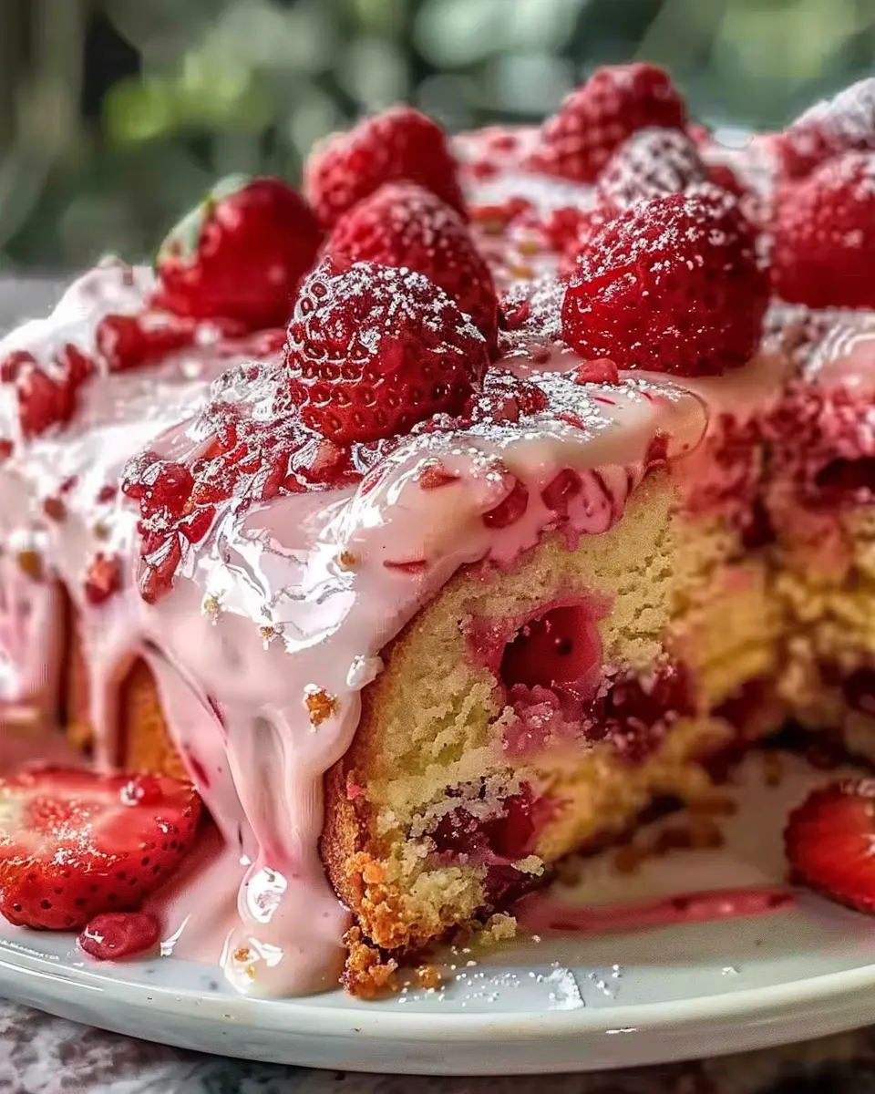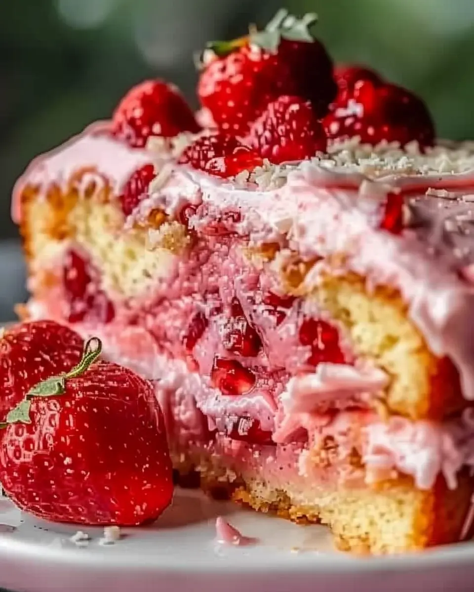 This Strawberry Honeybun Cake is a deliciously moist and indulgent dessert that perfectly combines the sweetness of strawberries with a rich, buttery cake.