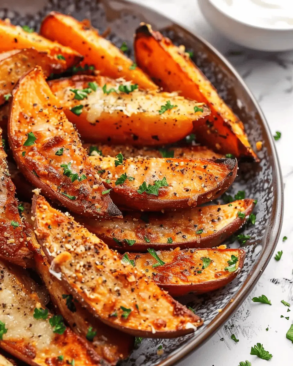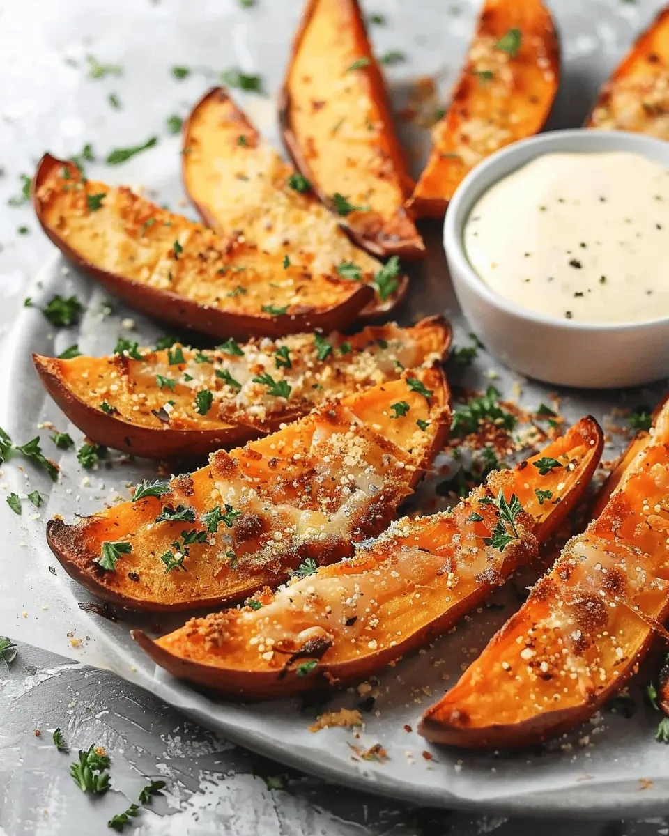 Keywords: sweet potato, recipes, baked, garlic, parmesan, wedges