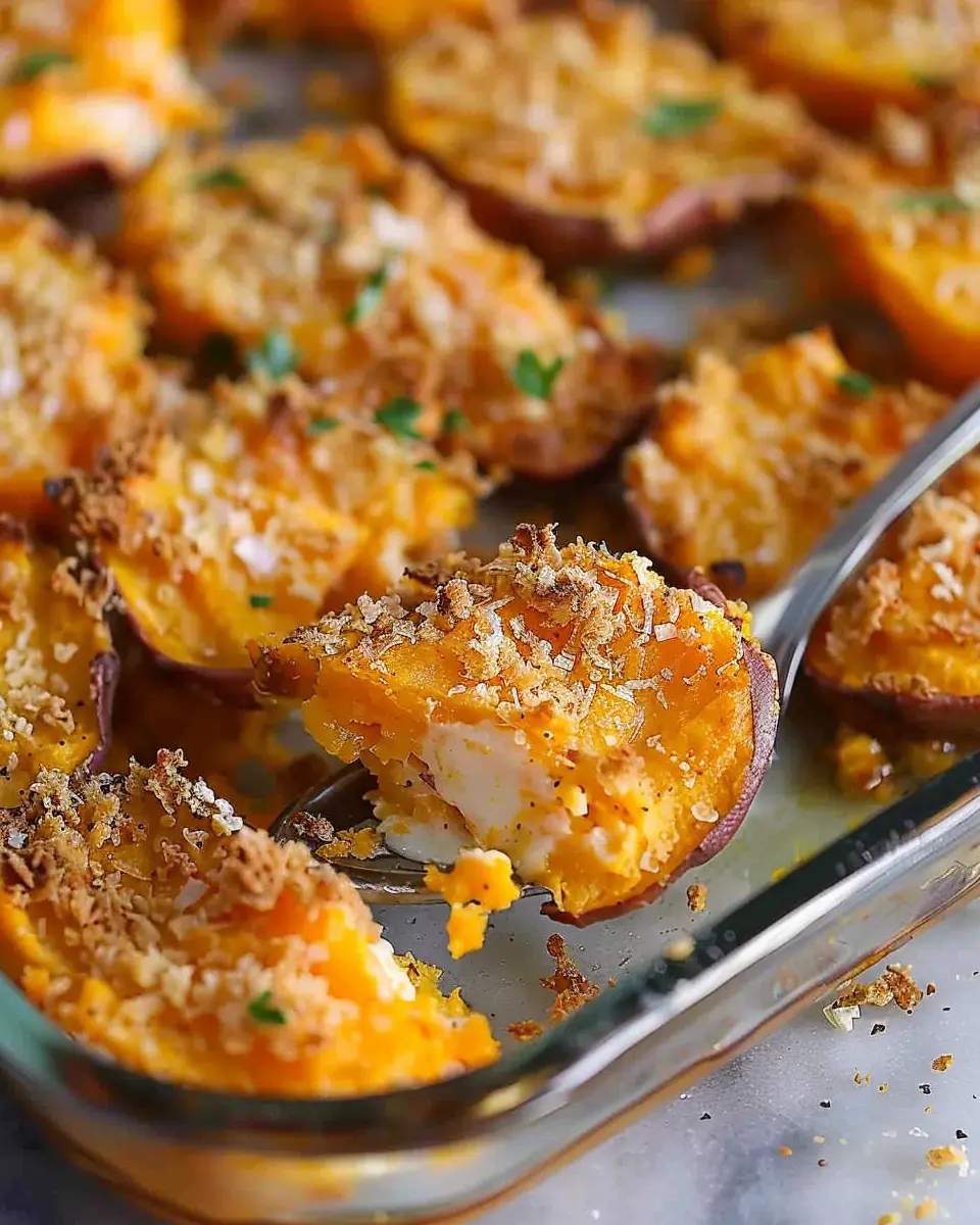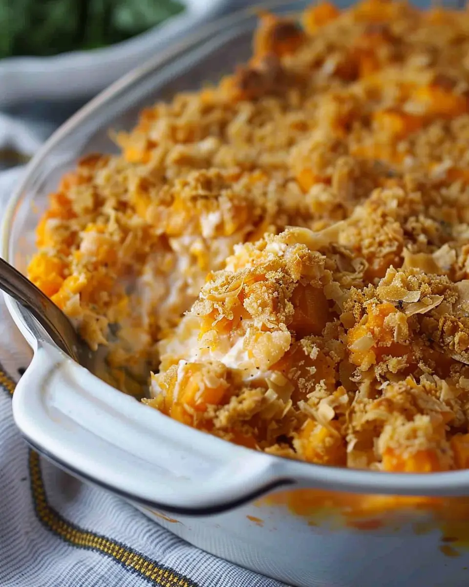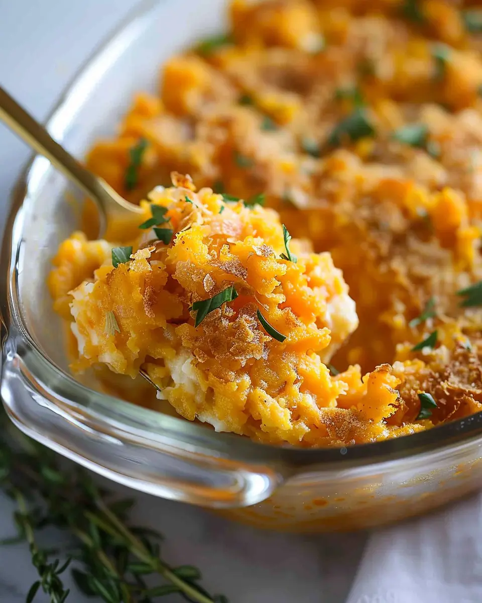 Deliciously indulgent funeral potatoes made with sweet potatoes and turkey bacon, perfect for any gathering.