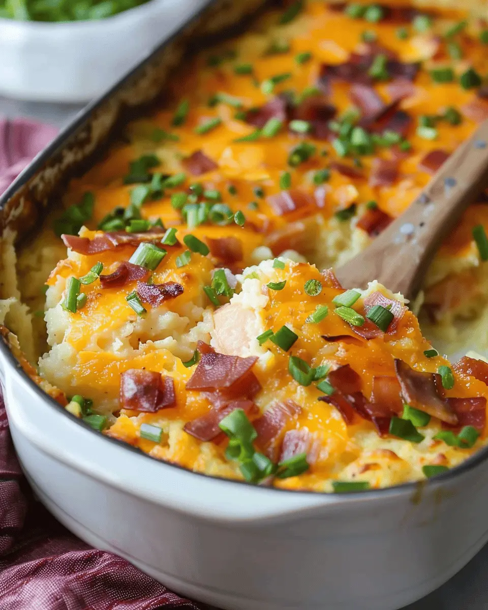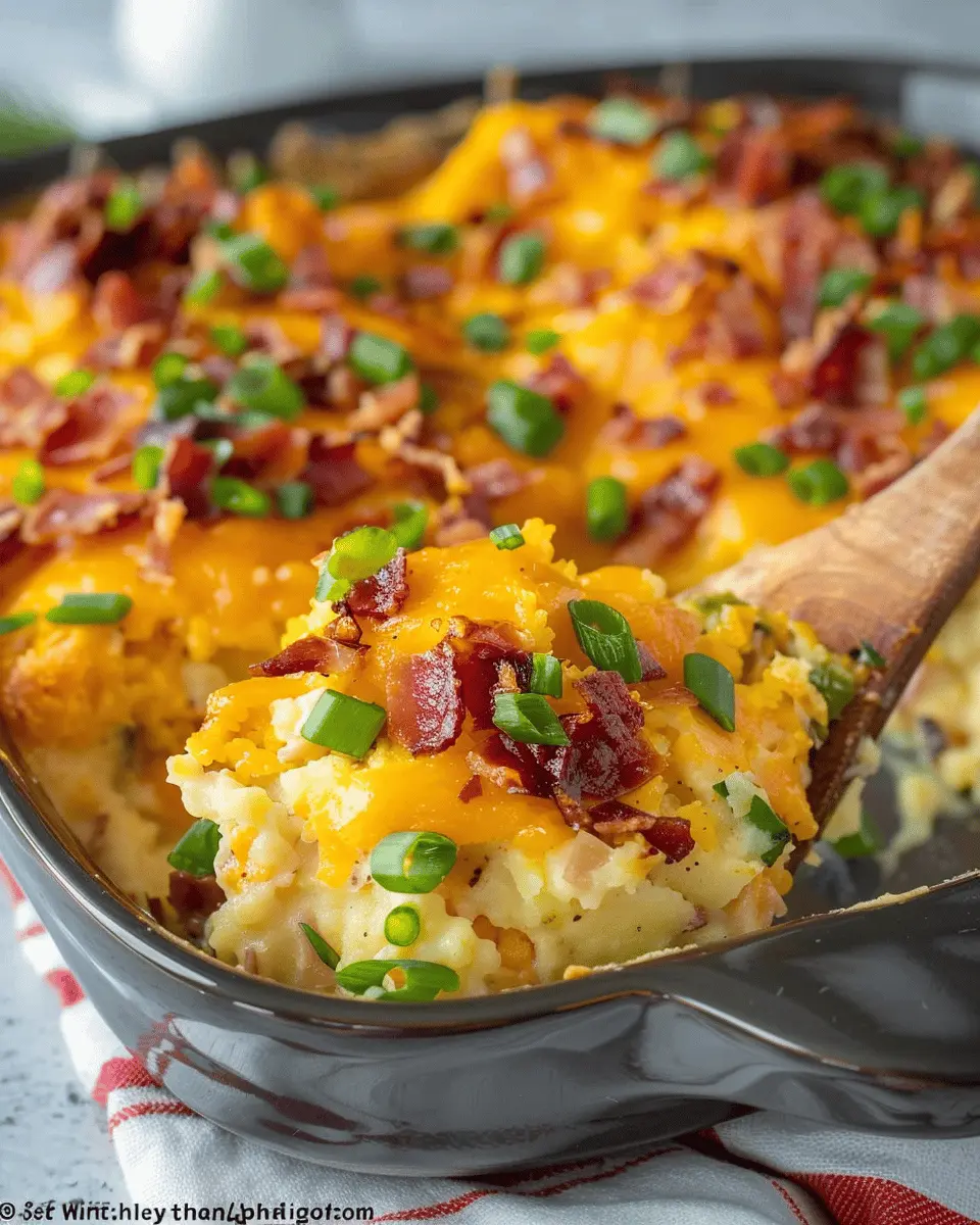 This loaded twice baked potato casserole combines the sweetness of sweet potatoes with savory ingredients for a delicious side dish.