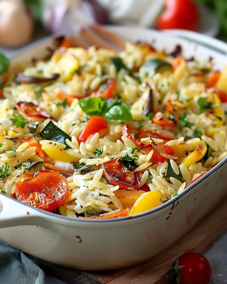 A creamy and hearty vegetable and ricotta baked orzo recipe that is perfect for a cozy meal.